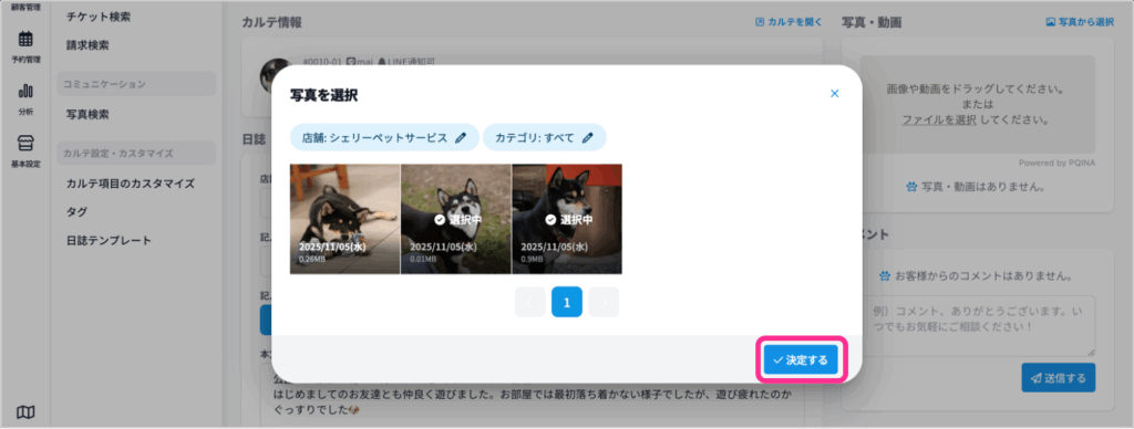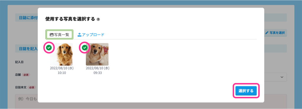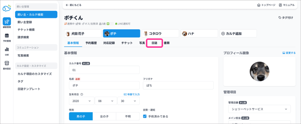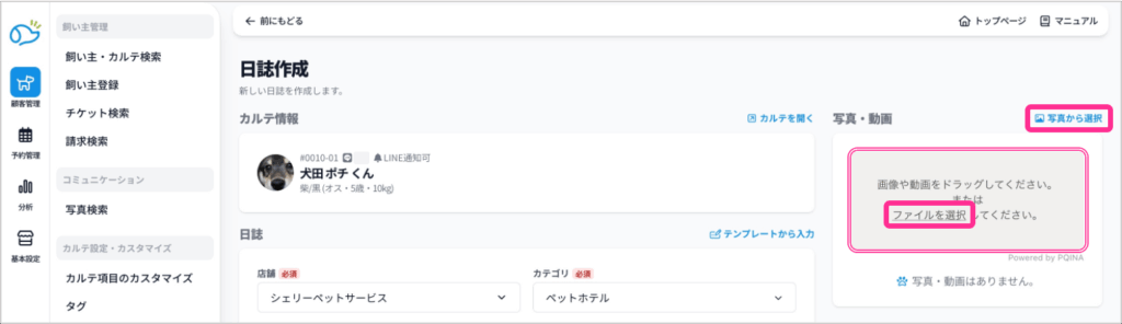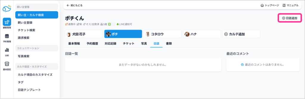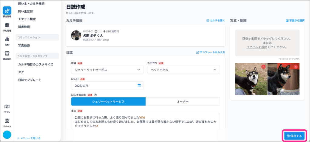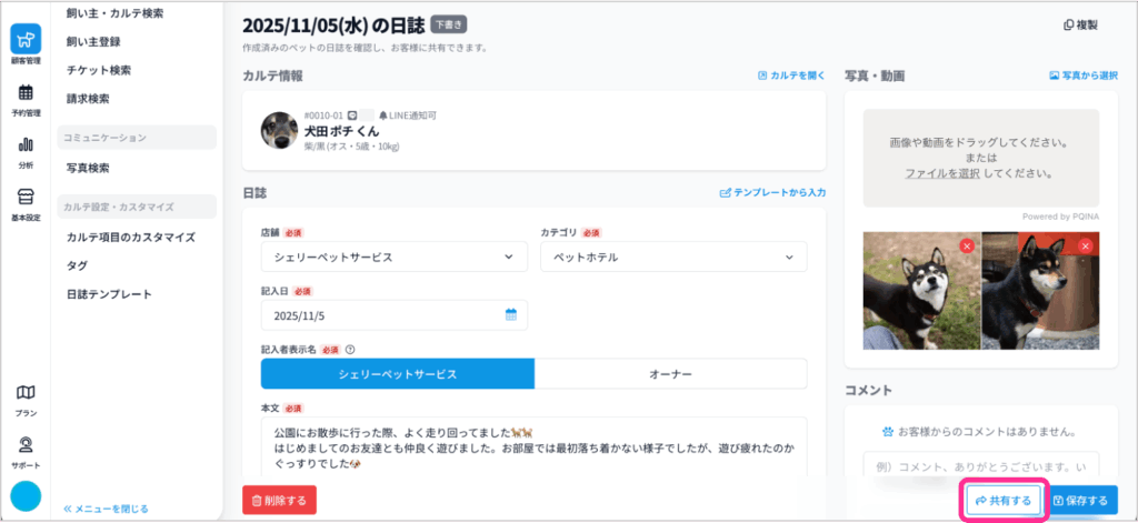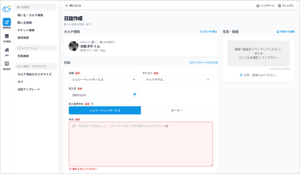 ペットをお預かりした時の様子を簡単に日誌にすることができます。飼い主様と連携していれば、簡単に共有することができます。日誌の作成・共有方法をご説明します。
