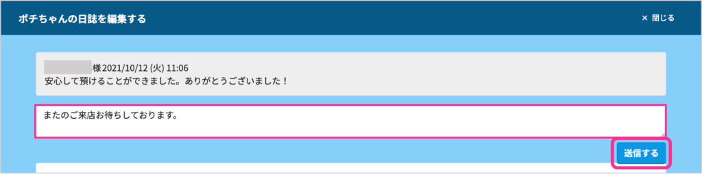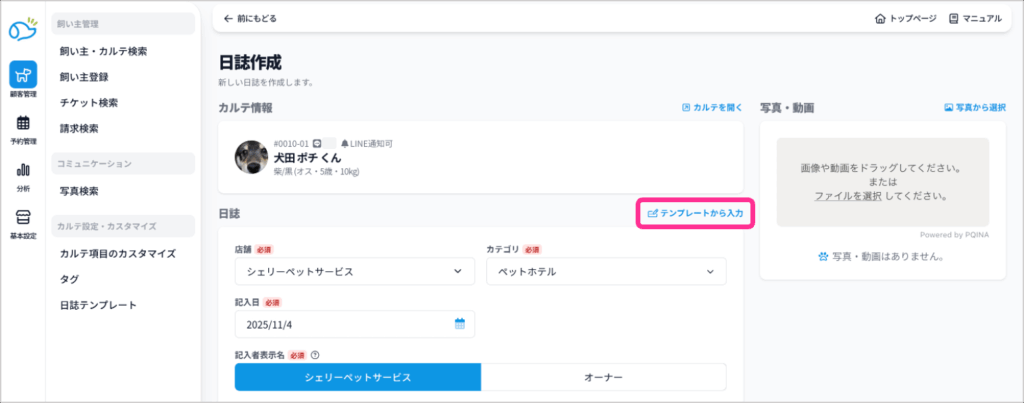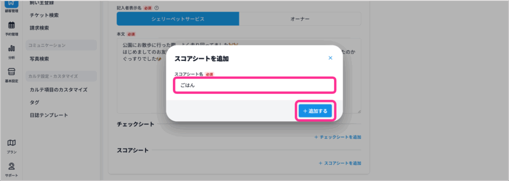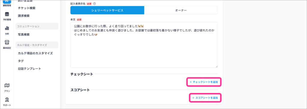 飼い主様の画面に記入者が表示されます。ログインしているリソース名か店舗名が選択できます。