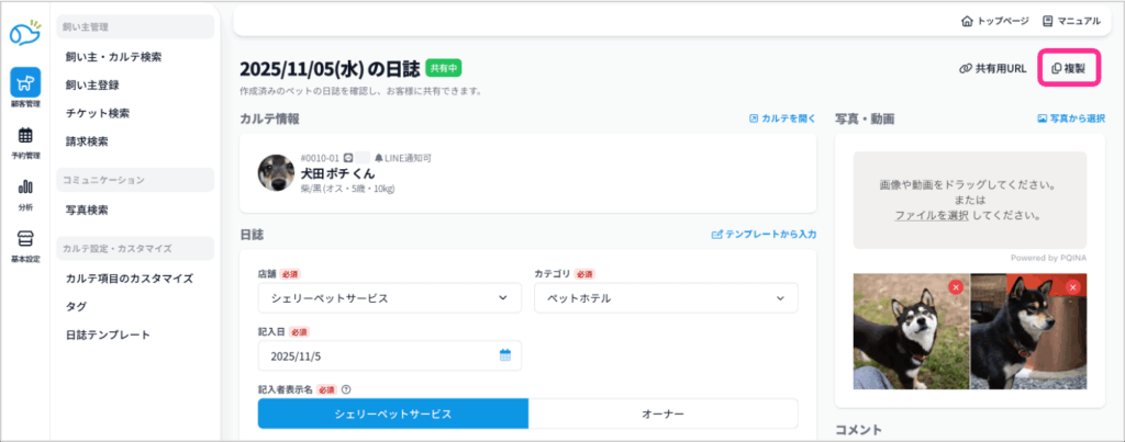 複製したい日誌を開き、画面右上の「複製」をクリック。必要に応じて項目や写真を修正して「保存する」をクリック。