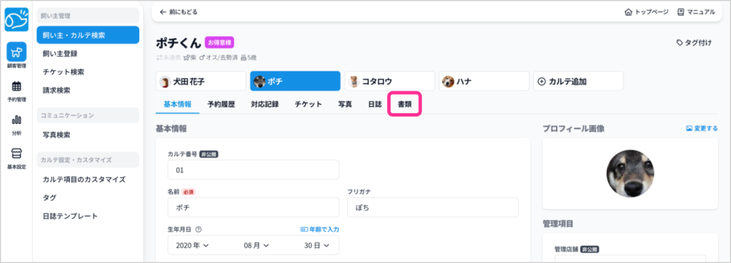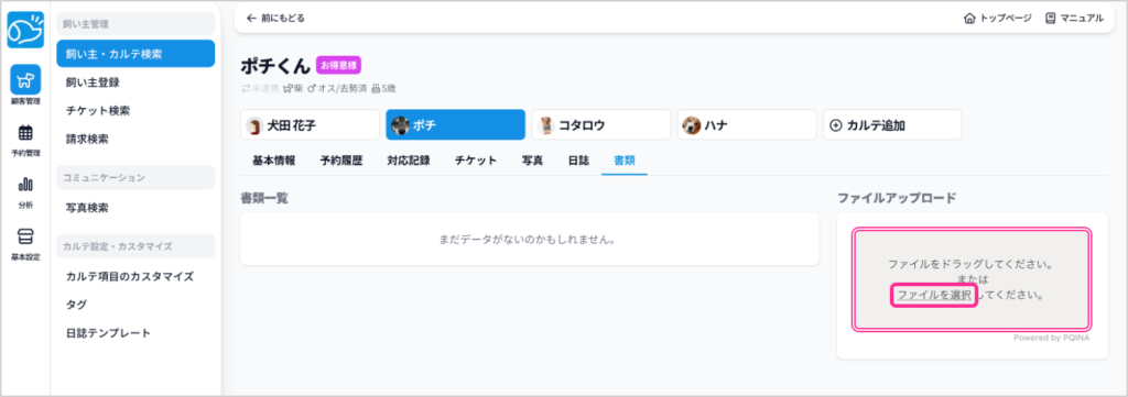書類などのファイルをカルテに紐付けて登録する方法をご説明します。こちらは飼い主様には共有されないので、店舗管理用としてお使いください。
