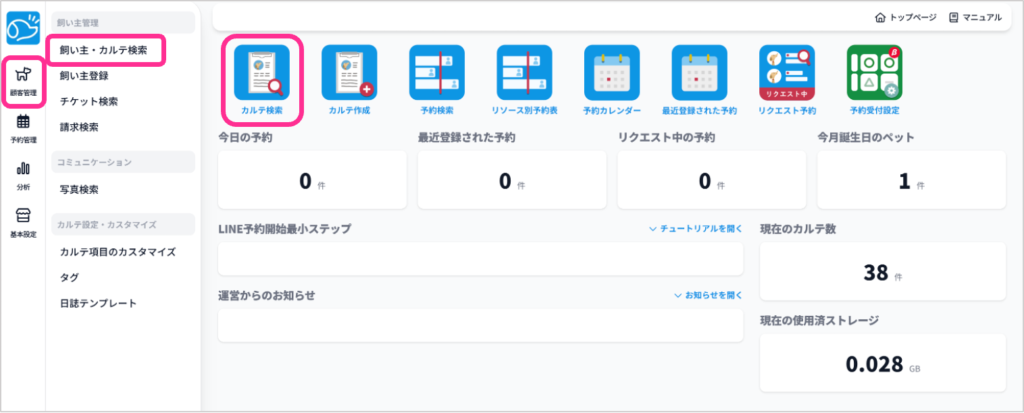 ❶トップ画面上部の「カルテ検索」もしくはサイドメニューの顧客管理から「飼い主・カルテ検索」をクリック。