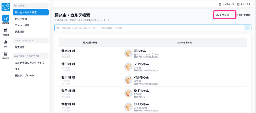 登録済みの飼い主様・カルテ情報を一覧にしたファイルを作成することができます。DM送付先のリスト作成などにお使いいただけます。