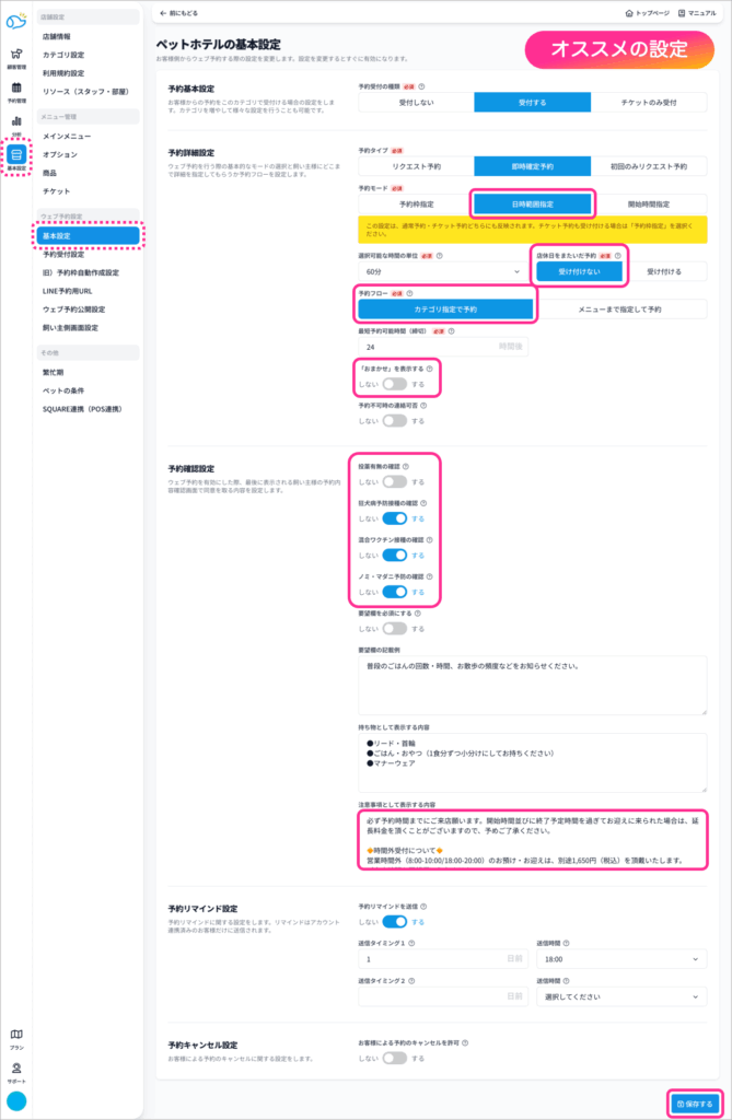 こちらはペットホテル・一時預かりの設定方法です。それ以外のクイックスタートガイドは、こちらのページをご覧ください。