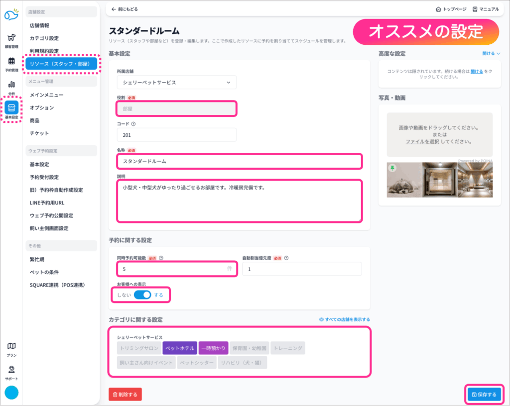 続いて、リソース(ホテルの部屋)の設定を行います。部屋のタイプが複数ある場合は登録しておくと、飼い主様が部屋を指定して予約することができます。画像を参照の上、設定してみましょう。