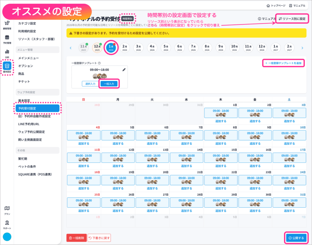 ここまで入力したら、画面右下の「公開する」をクリックして、飼い主様側の予約画面に予約受付を公開します。