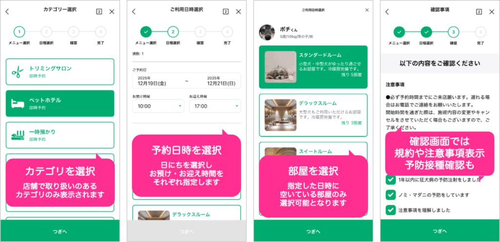 設定の前に、予約画面をご紹介します。飼い主様の予約ステップもとてもシンプルです。どなたでも簡単に操作してご予約いただけます。
