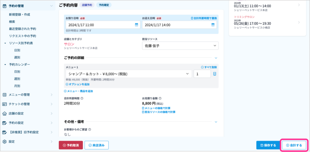 メニューや商品を追加する場合は、予約の詳細画面に戻って追加してください。画面上部の「予約内容」で予約詳細画面に戻れます。