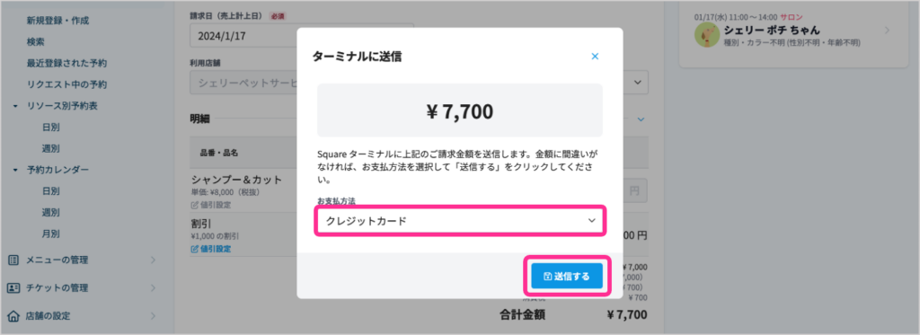 ❻支払い方法を選択し、「送信する」をクリック。その後、Square端末で決済処理をしてください。