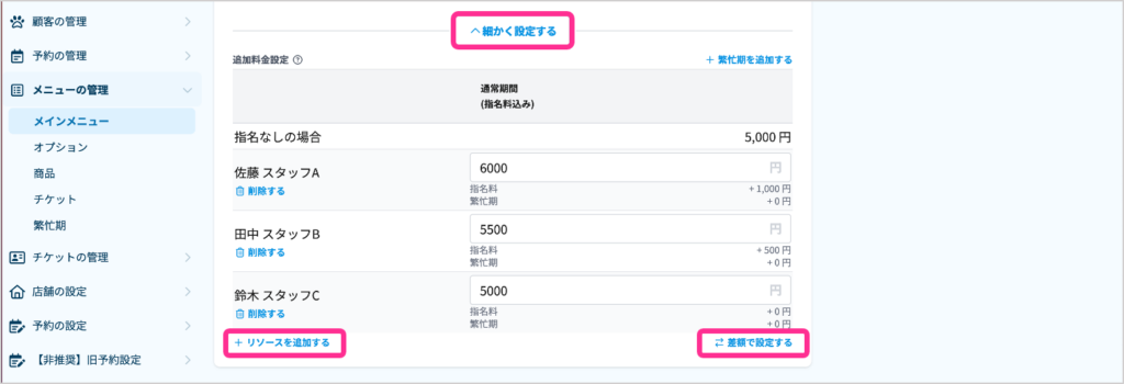 こちらも「差額で設定する」をクリックすると、繁忙期・指名料のみで設定することもできます。