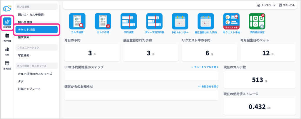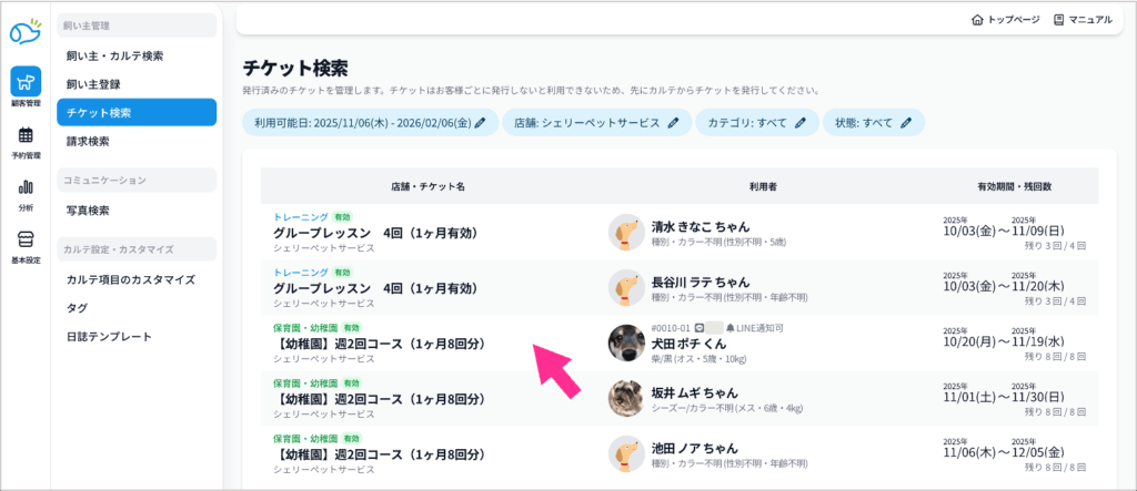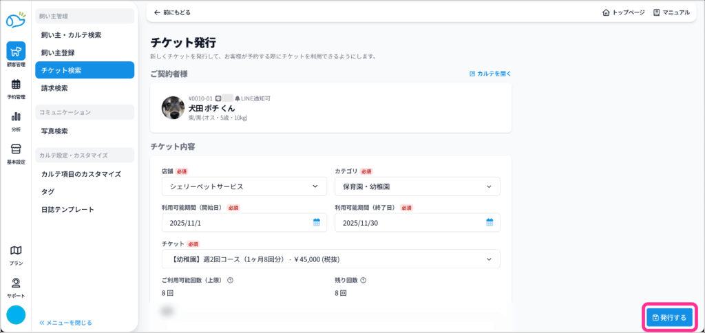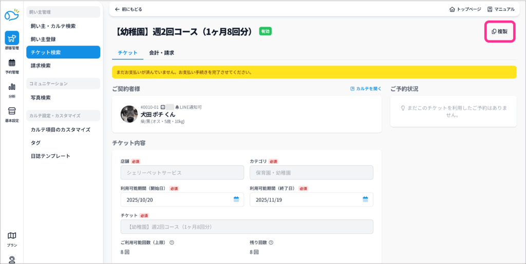 お客様の管理発行済みのチケットを複製する2024.04.042025.11.20発行済みチケットの複製方法をご説明します。複製して一部の項目のみを修正して登録することができ、全ての項目を最初から入力するより、簡単に登録することができます。❶サイドメニューの顧客管理から「チケット検索」をクリック。❷対象のチケットをクリック。❸画面右上の「複製」をクリックします。❹必要に応じて項目を修正し、画面右下の「発行する」をクリック。* 利用者(ペット)は変更できません。利用者を変更したい場合は、複製ではなく新たにチケットを発行してください。こちらのマニュアルもよく読まれていますメニューやオプションを複製する飼い主様を招待するSquare(スクエア)と連携する飼い主様の詳細ページの見方ペットのカルテページの見方