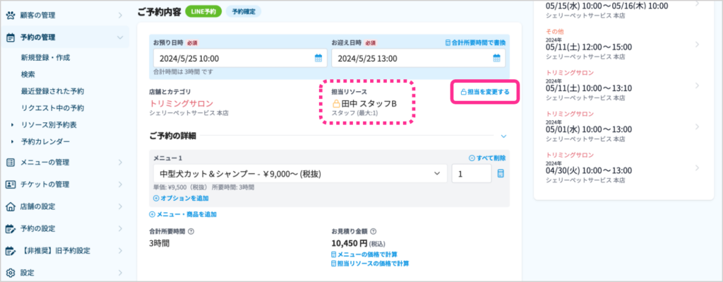 ※予約情報を変更しても、飼い主様には通知されません。必要に応じて、お客様にご連絡の上変更処理を行ってください。