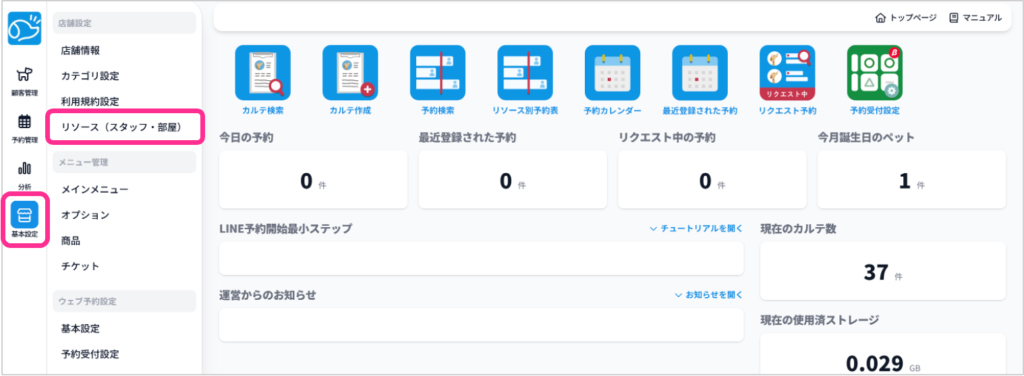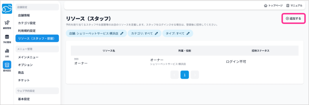 * ウェブ・LINE予約をされる場合は、必ず1つ以上リソースを登録しておく必要があります。