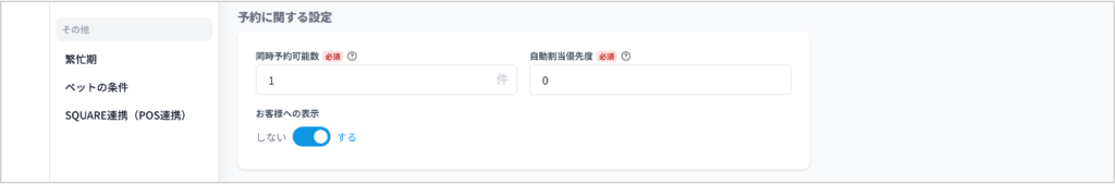 ウェブ・LINE予約を同時間帯にに受け付ける件数のこと。例えば「2」と設定すると、同時間帯に2件の予約を受け付けられるようになります。