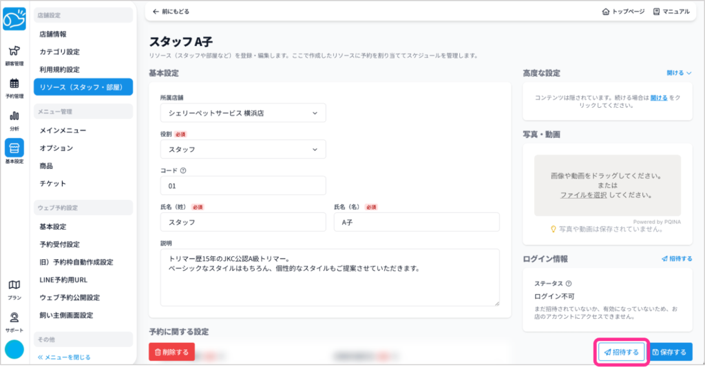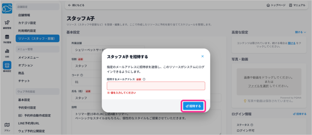 ❺招待したいスタッフの設定画面を開き、画面右下の「招待する」をクリック。