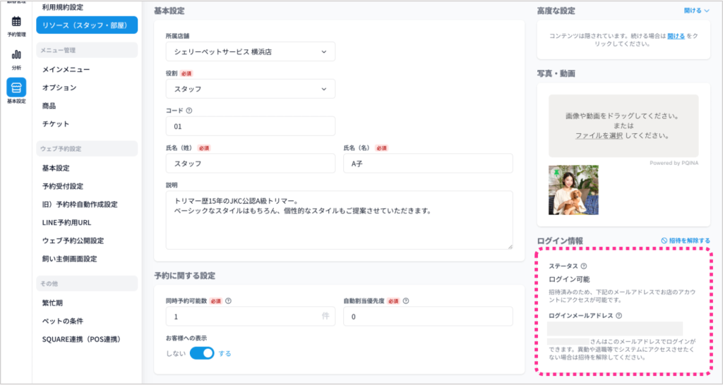 設定が完了すると、スタッフの設定画面のログイン情報が下記画像のようになります。
