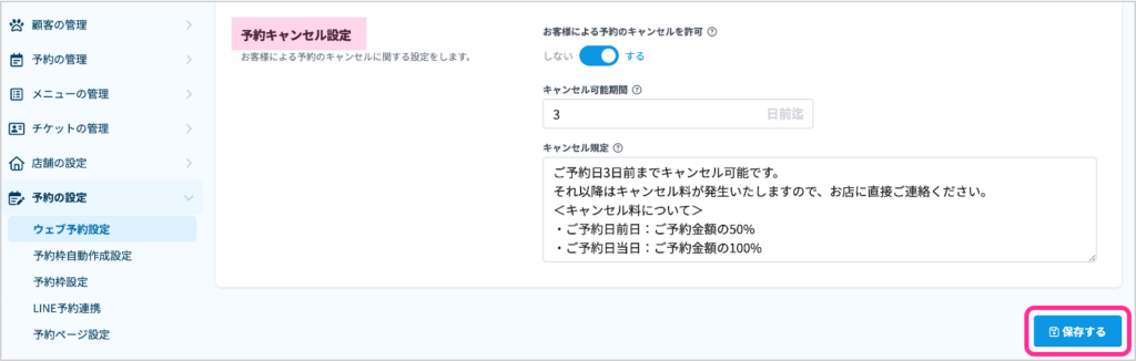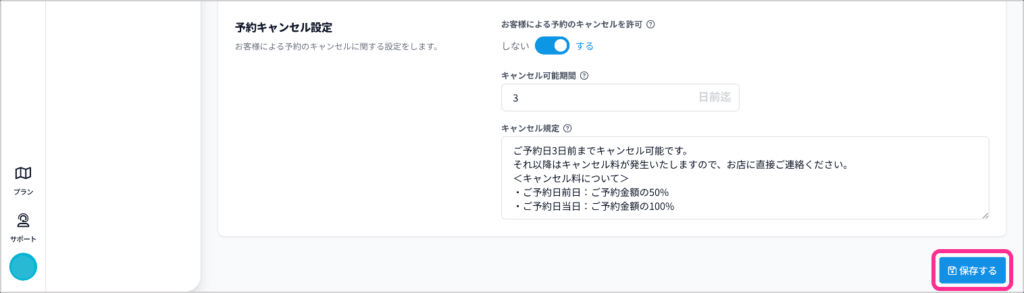 キャンセル可能期間とキャンセル規定を入力し、「保存する」をクリック。