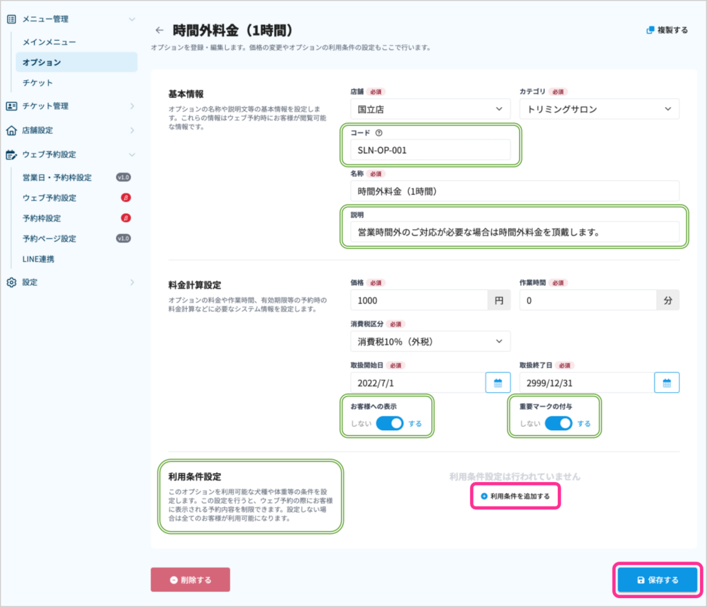 * メニューの登録画面に「お客様への表示」や「ペットの条件設定」などの項目がございますが、これらはLINE予約の設定となります。LINE予約を利用される場合は、まずはこちらのガイドをご覧ください。設定の手順や、各設定の説明を記載しております。