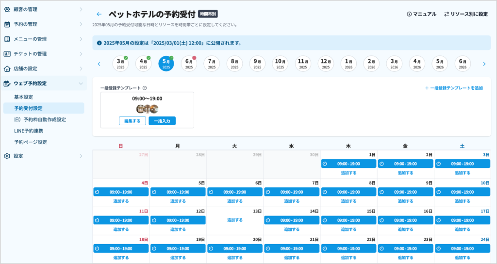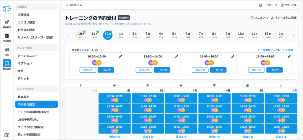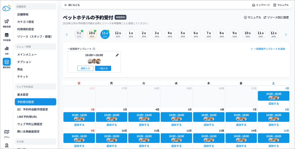 ❹設定したい月を選択し、テンプレートの「一括入力」をクリックすると、テンプレートの内容が一ヶ月分反映されます。受付設定はクリックして削除することもできます。