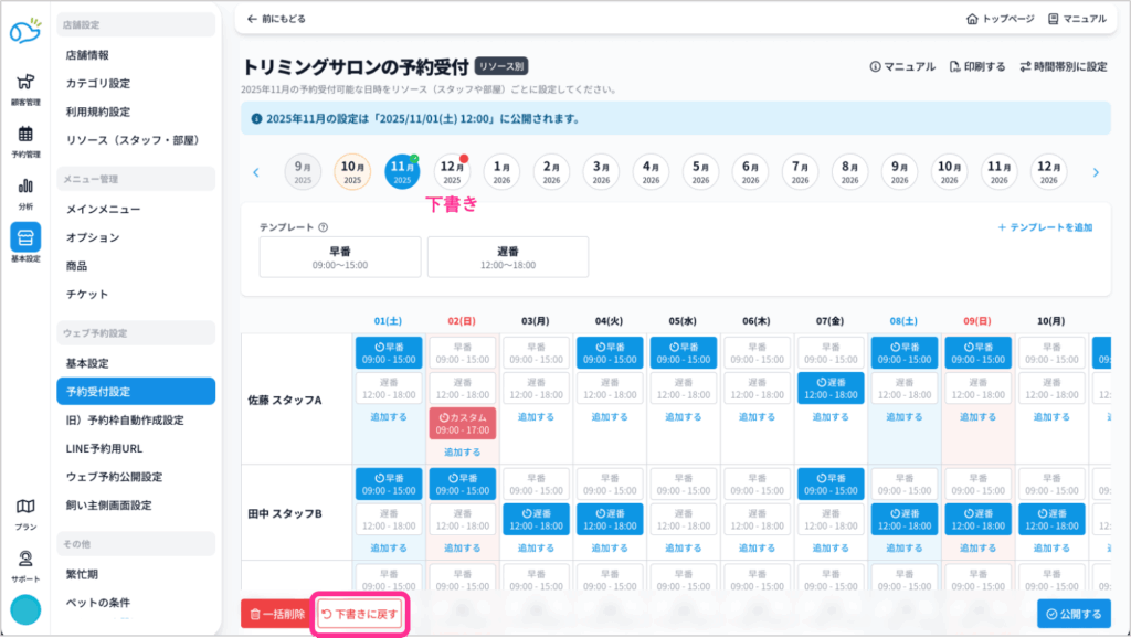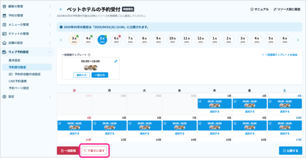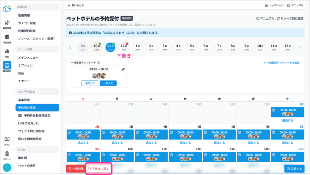 これからは手動で作られた予約枠は、新しい予約受付設定画面で「下書き状態」で移行されていますので、必ず「公開する」からすぐに公開か、公開予約をしてください。