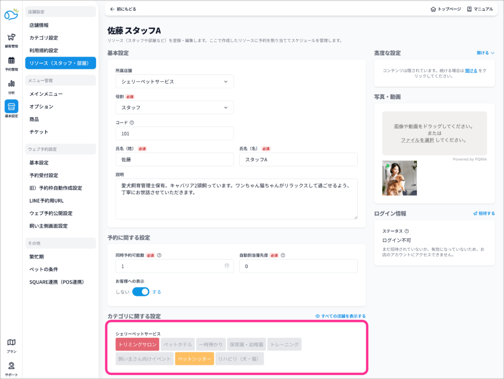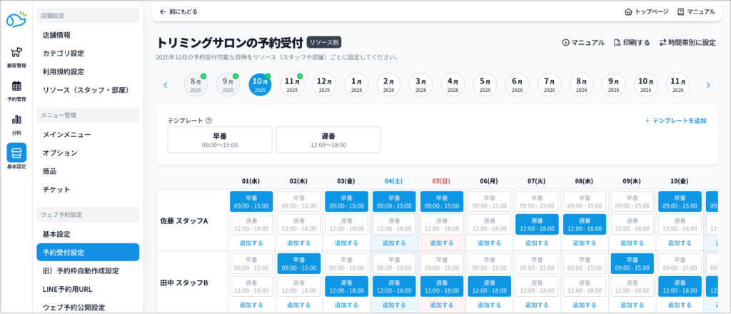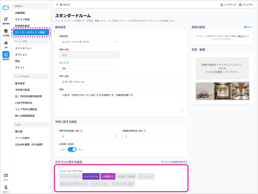 こちらでは、いつ、どのリソースで予約を受け付けるかの設定方法をご説明します。飼い主様が予約できる時間帯と、選択できるリソース(スタッフ・部屋)を設定します。