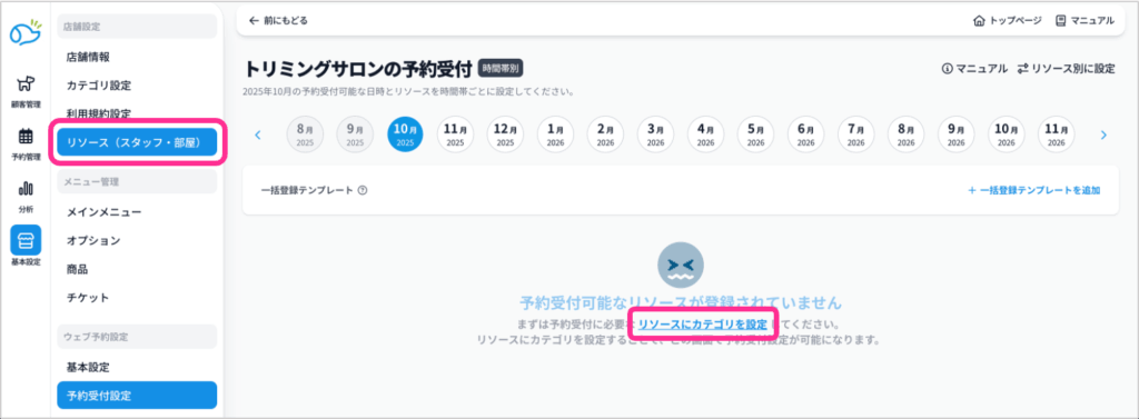 画面中央の「リソースにカテゴリを設定」をクリックするか、サイドメニューの「リソース(スタッフ・部屋)」をクリックしてください。