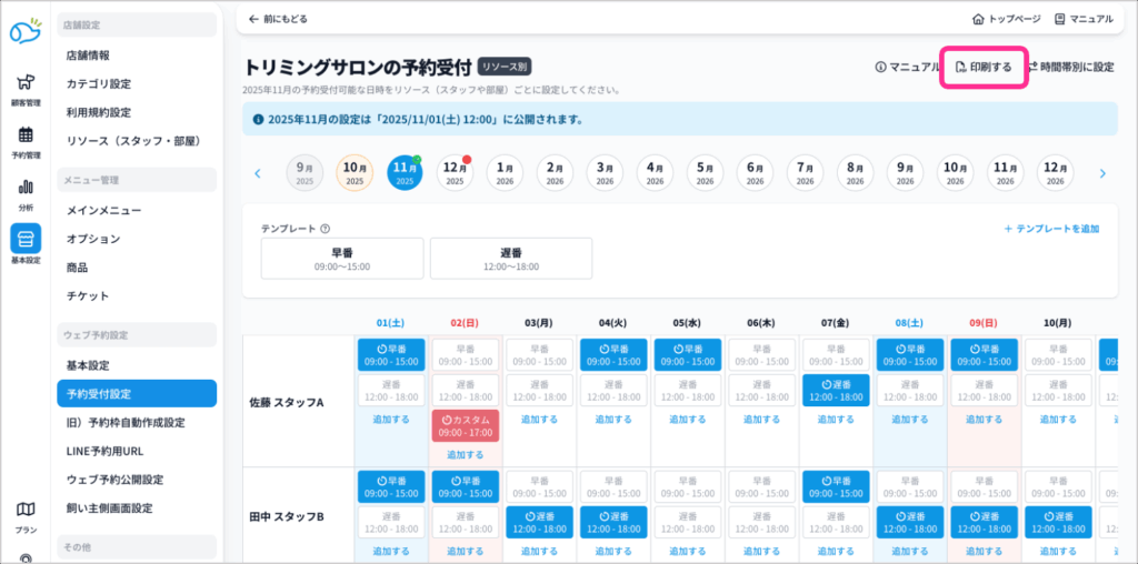 リソース別の設定画面では、画面右上の「印刷する」から設定されたものをシフト表としてダウンロードすることもできます。