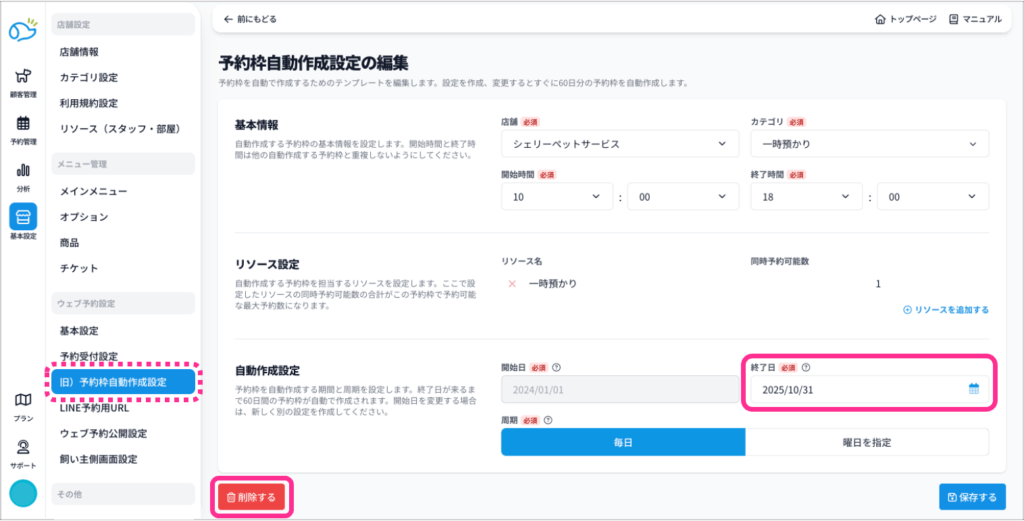 新たに新画面で設定をしていく場合は、予約枠自動作成設定を削除するか、終了日を修正してしてください。