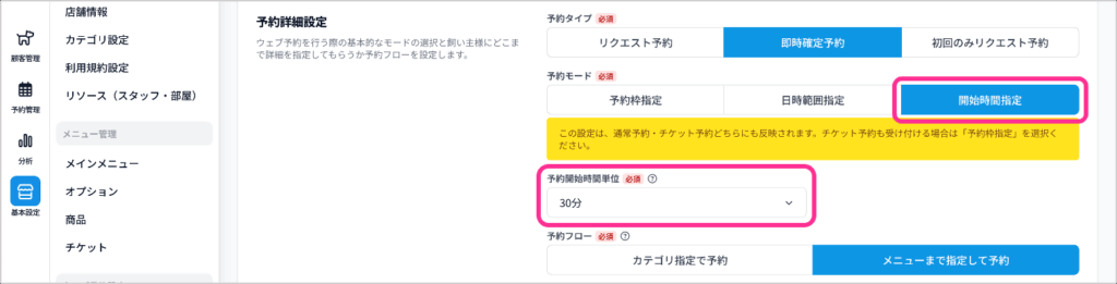 予約モードを「開始時間指定」にし、予約フローを「カテゴリ指定で予約」した場合