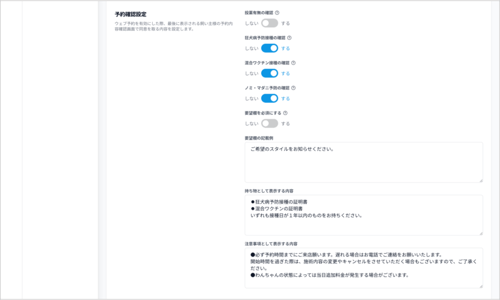 飼い主様が予約をする際の確認画面に表示される内容を設定します。