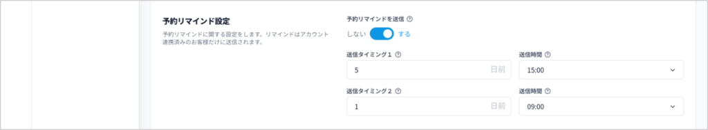 カルテ連携がされているお客様に、予約のリマインドを送る設定をします。予約リマインドを送信「する」を選択すると、送信タイミングを設定できます。リマインドは最大2回まで送付できます。