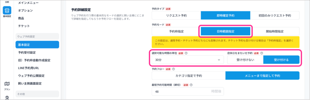 予約モードを「日時範囲指定」にすると、新たに「選択可能な時間の単位」と「店休日をまたいだ予約」という項目が出てきます。