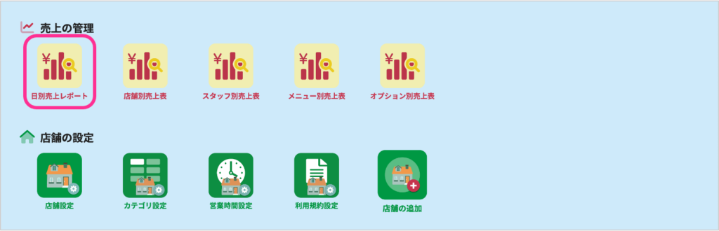 ❷画面をスクロールし、売上の管理の「日別売上レポート」をクリックします。