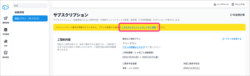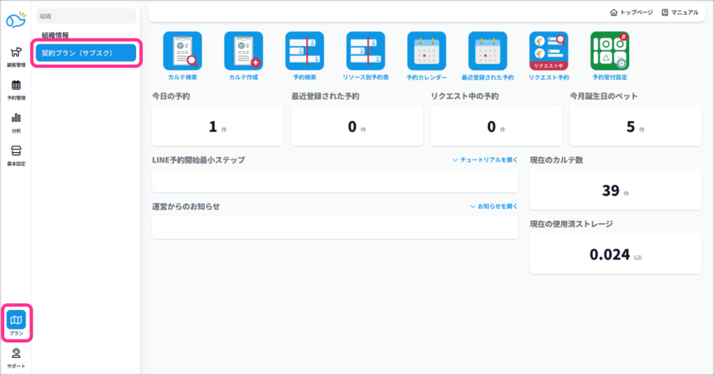 ❶サイドメニューのプランから「契約プラン(サブスク)」をクリック。
