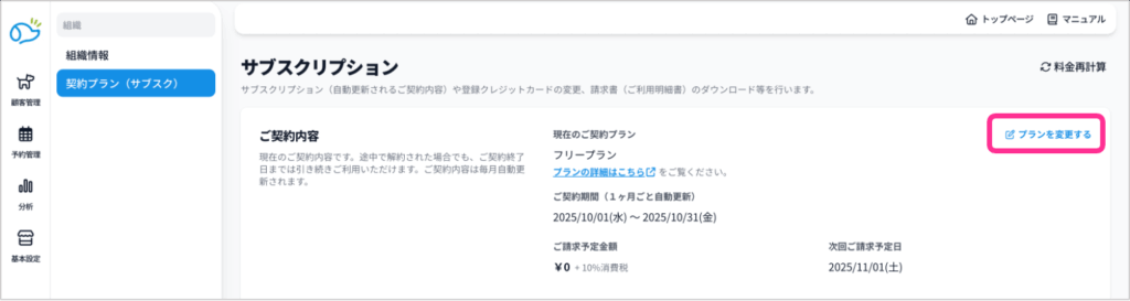 ❻画面右上の「プランを変更する」をクリック。
