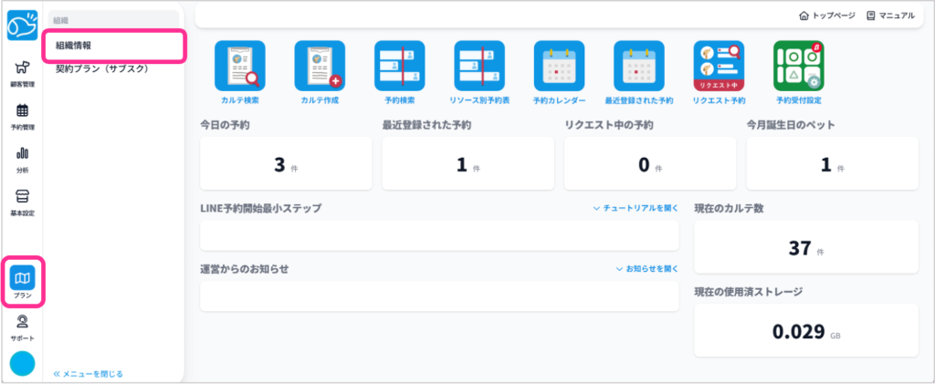 ❶サイドメニューのプランから「組織情報」をクリック。