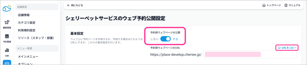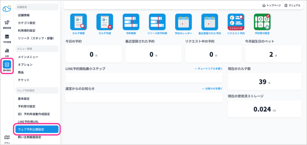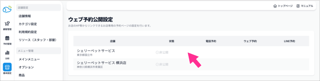 ❶サイドメニューの基本設定から「ウェブ予約公開設定」をクリック