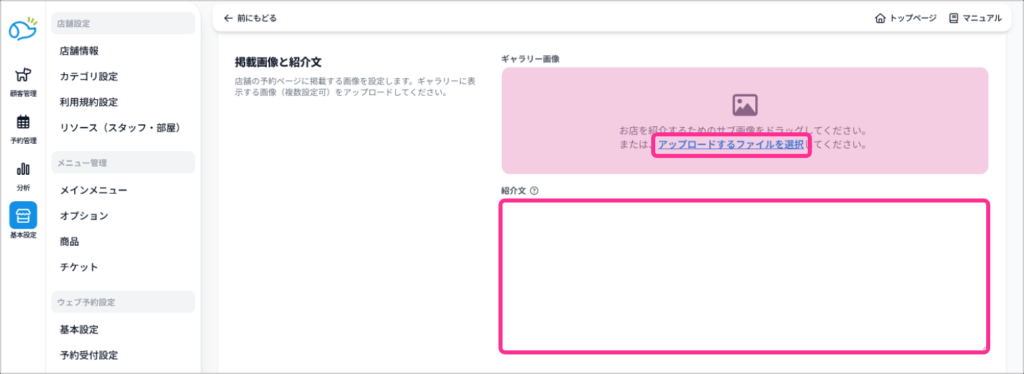 お店の紹介画像を掲載することができます。画像設定エリアに画像ファイルをドラッグします。スマホやiPadからは、「アップロードするファイルを選択」から、ファイルを指定します。画像は複数設定可能です。