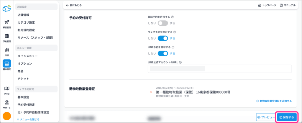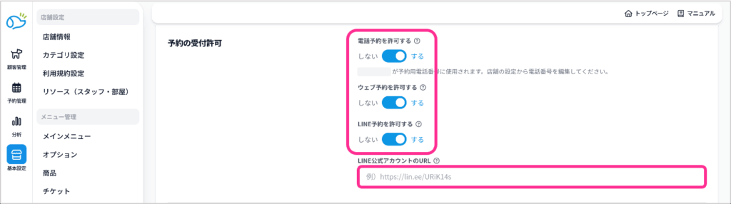 電話・ウェブ予約・LINE予約の受付許可をそれぞれ設定します。許可すると、予約ページに予約受付ボタンが表示されます。