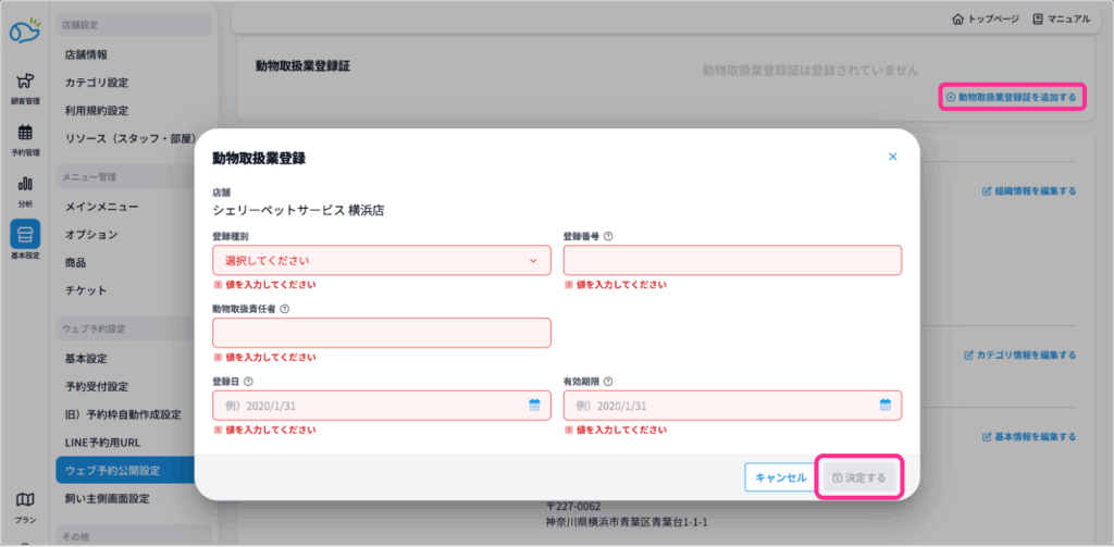 「動物取扱業登録証を追加する」をクリックし、全ての項目を入力して「決定する」をクリックします。