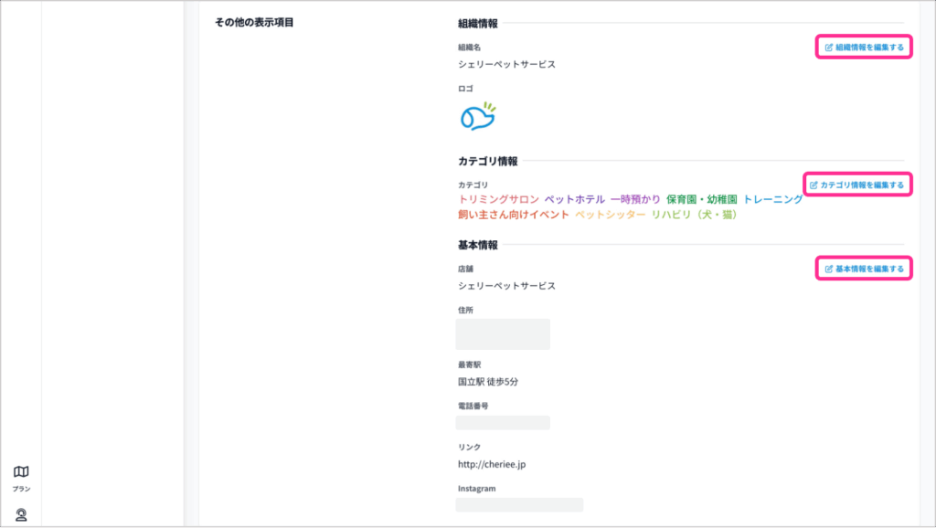 予約ページには、その他の情報も掲載されます。内容は【その他の表示項目】でご確認いただけます。情報を修正したい場合は、「編集する」からそれぞれの設定ページに飛び、内容を修正してください。