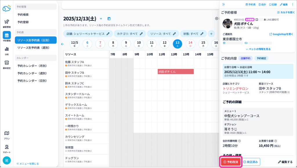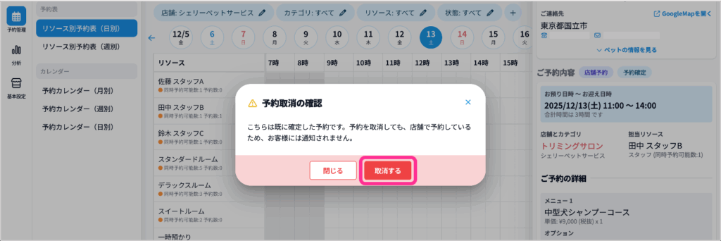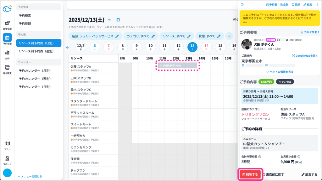 予約をキャンセルすると、「予約削除」ができるようになります。削除をすると予約履歴にも残らず、予約表やカレンダーからも予定が消えます。