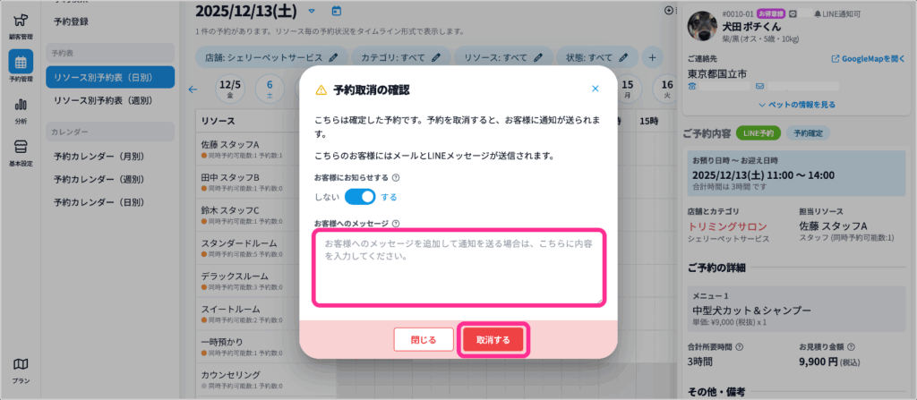 ウェブ・LINE予約の場合、キャンセルをするとお客様へ通知が送られますが、お店からのメッセージを追加することができます。