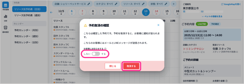 既にお客様と連絡を取り合った上でのキャンセルなど通知をしたくない場合は、確認画面のお客様にお知らせするを「しない」にして「取消する」をクリック。
