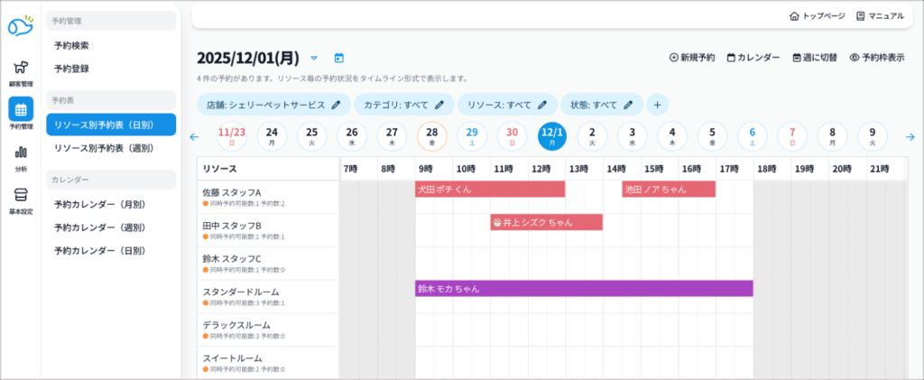 スタッフ・部屋を登録しておけば、それぞれのスケジュール管理ができるようになります。