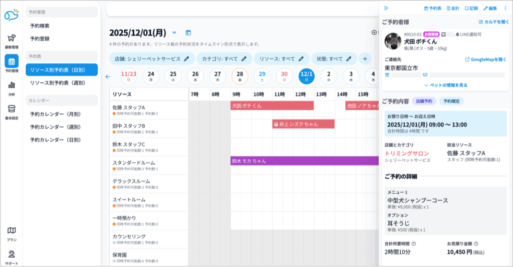 店舗での予約管理だけでなく、飼い主様からも予約を受け付けたい方は、LINE予約がオススメです。それぞれの店舗に合った柔軟な予約設定が可能となり、カテゴリごとに設定を変えることもできます。