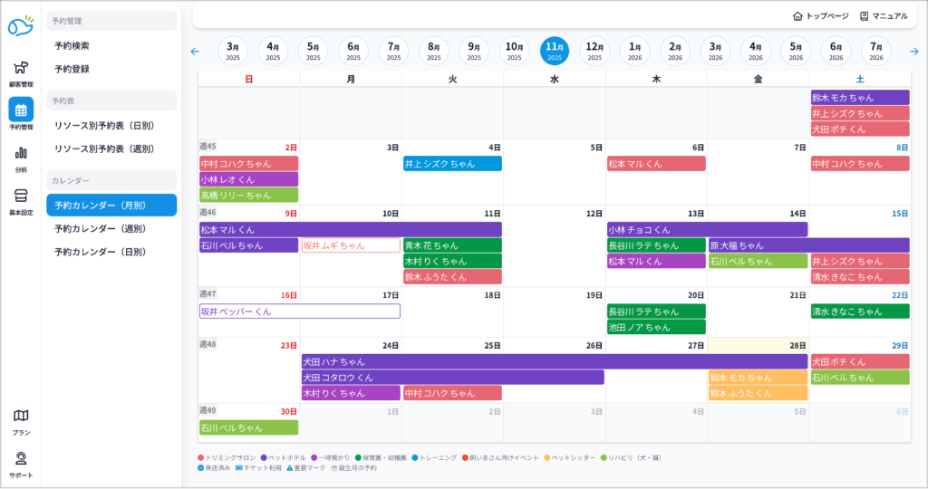 カレンダー表示で予約を確認することもできます。月間で予約状況を把握したい場合は、こちらをご覧ください。色の違いはトリミングやホテルなどのカテゴリーの違いです。こちらもクリックで予約の詳細を確認することができます。