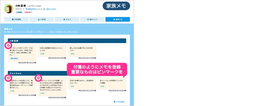 関連マニュアル ⚫︎メモする[カルテ基本メモ] ⚫︎お客様とペットの情報をメモする[家族メモ]